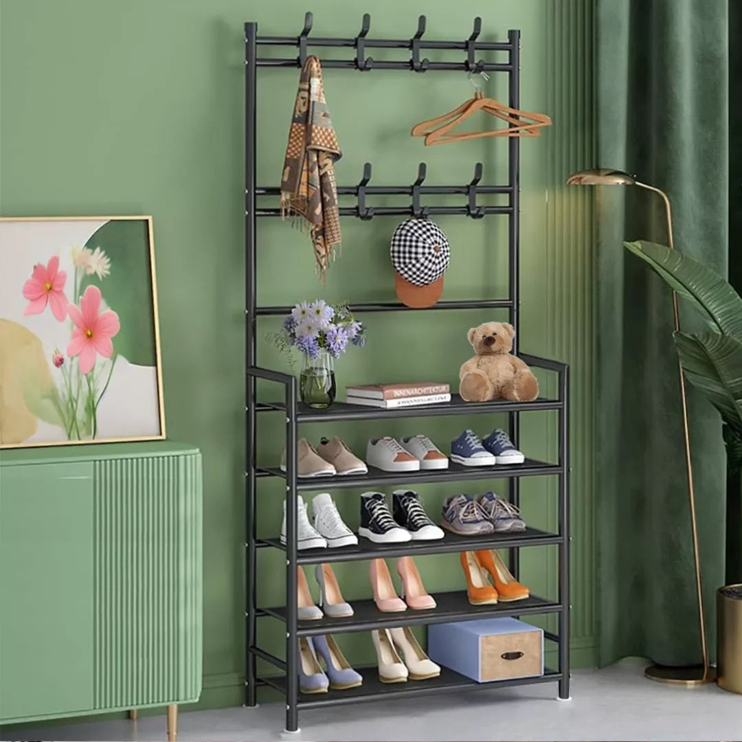 Mantén tu hogar siempre ordenado con este práctico zapatero perchero 2 en 1. Su diseño moderno y resistente te permite organizar tus zapatos, ropa, bolsos y accesorios en un solo lugar, aprovechando al máximo el espacio.